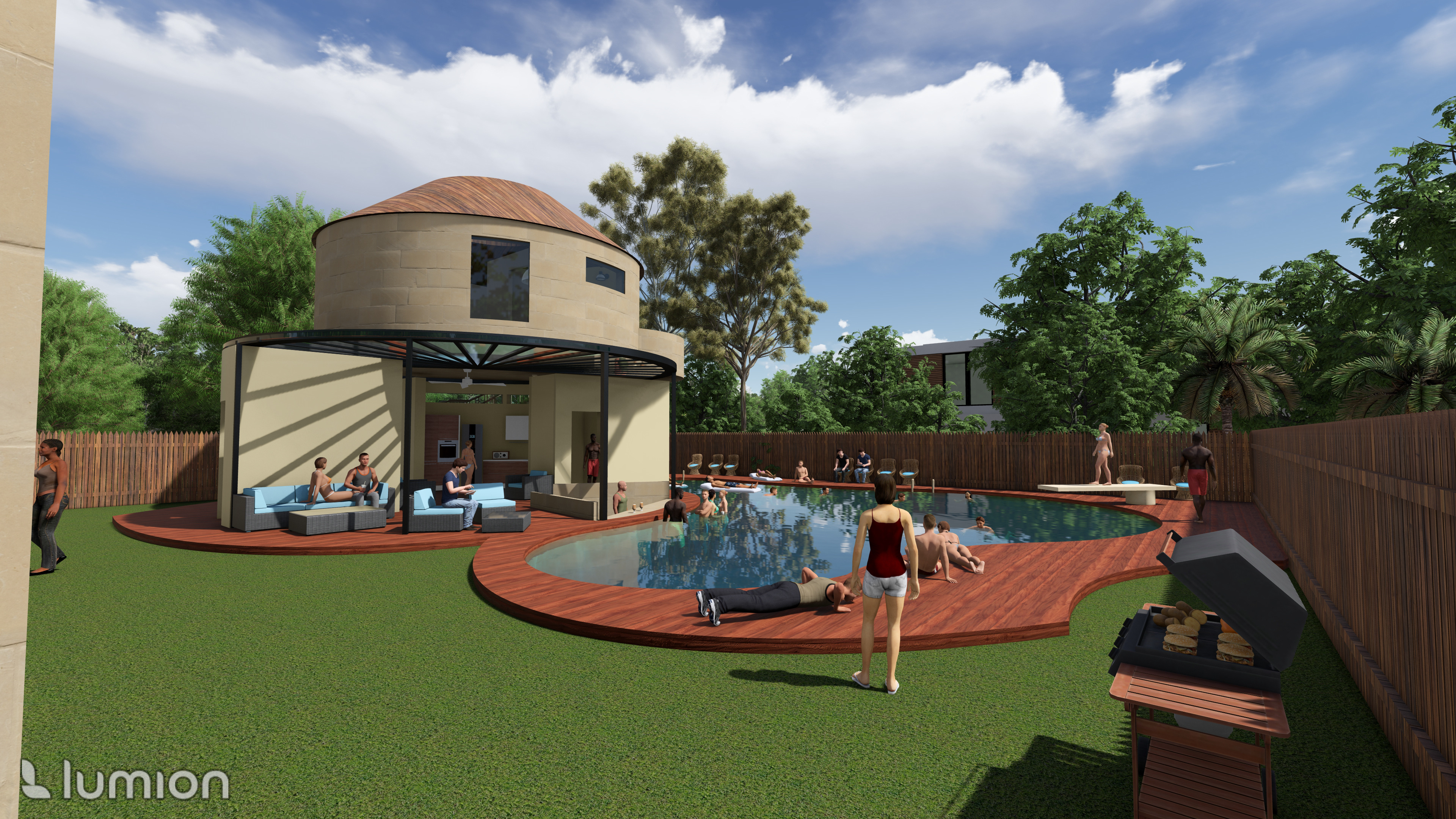 Site plan, floor plans, section, and renders of my final iteration of the pool house.