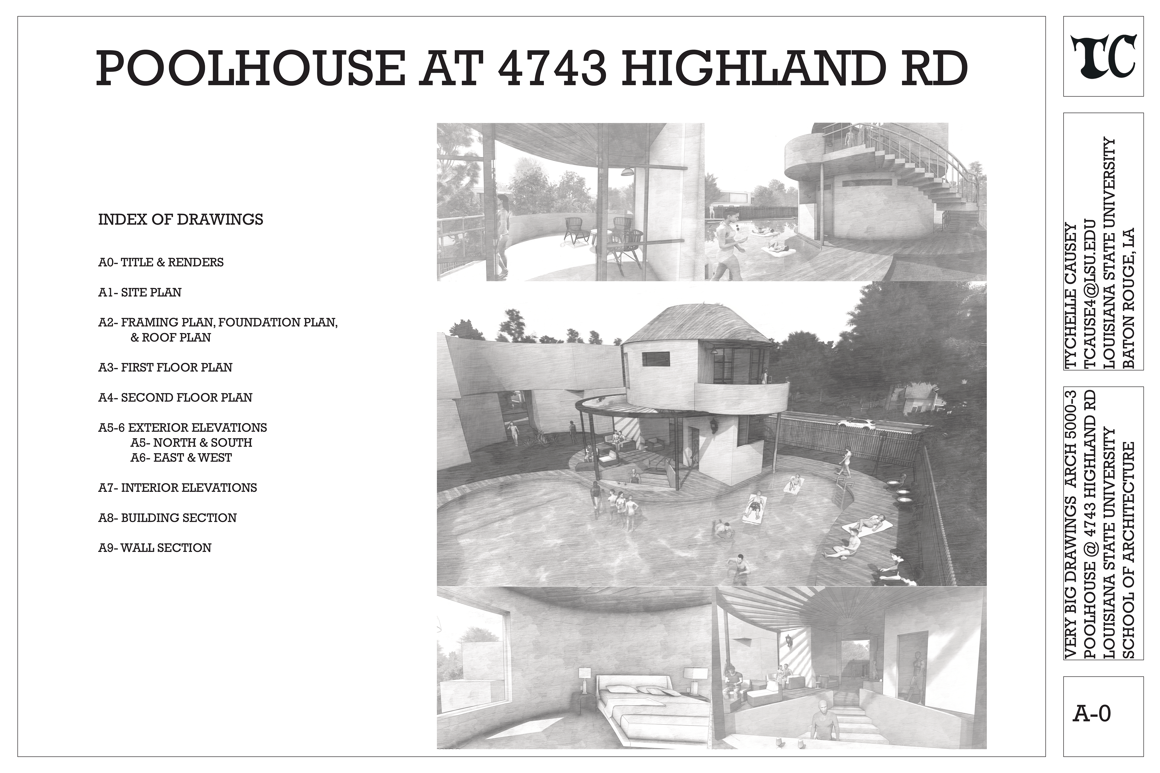 The Pool House at 4743 Highland Road is a project in which my classmates and I were tasked with designing a pool and pool house for inhabitants of our choosing and creating a full set of construction documents. With the site being so close to Louisiana State University, the idea for this assignment was to design an entertainment space for large and intimate parties.